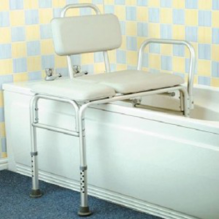 Siège avec une assise large ayant 2 pieds à l'intérieur et 2 pieds à l'extérieur de la baignoire. En passant par dessus les bords de la baignoire, il permet un transfert latéral facile, tout en étant assis.