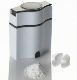 - BROIE : le couvercle se visse et se dévisse pour broyer les comprimés et les transformer en poudre